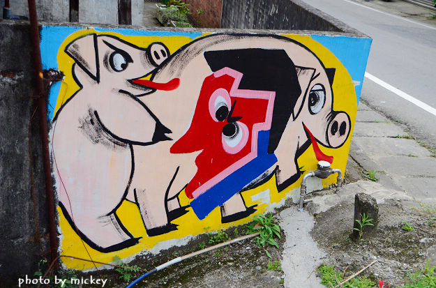 軟橋社區最常看到的彩繪有長頸鹿、電線杆上的財神爺和頗有客家氣息的神豬